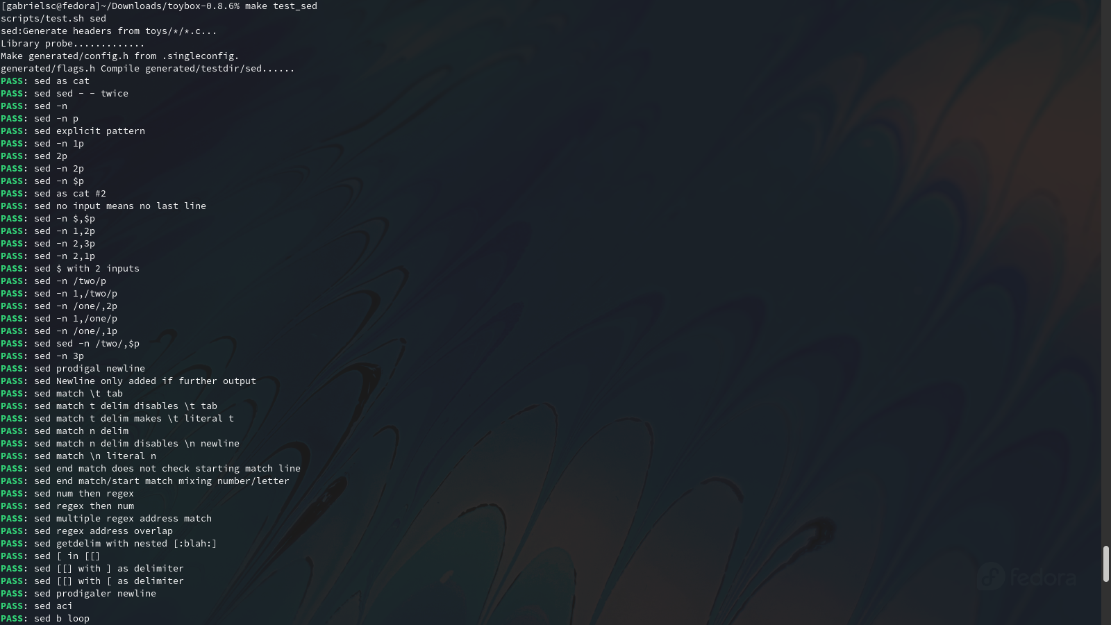 O toybox também disponibiliza seus próprios arquivos de teste também dentro do diretório tests. No total, ele realiza 91 testes com o toybox sed.